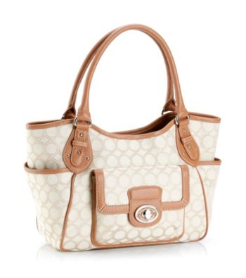 A classic handbag featuring a jacquard pattern mixed with Lurex for a glam detail. Two outer slip side pockets Snap closure Two inner slip pockets Zip pocket Center zip compartment 12" x 10" x 5" Imported Retail Price in US - USD85.00 Sale Price - RM370.00 Winter White